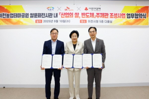 이천시(시장 김경희)는 9월 10일 이천시청에서 SK하이닉스, 경기사회복지공동모금회와 함께 ‘산업의 쌀, 반도체’ 주제관 조성을 위한 지역사회 상생협력 업무협약(MOU)을 체결했다. 이날 협약식에는 이천시 김경희 시장, SK하이닉스 정상록 부사장, 경기사회복지공동모금회 김효진 사무처장이 참석한 가운데 ‘산업의 쌀, 반도체’ 전시 공간을 조성하는 데 협력하기로 뜻을 모았다. 1. 이천농업…