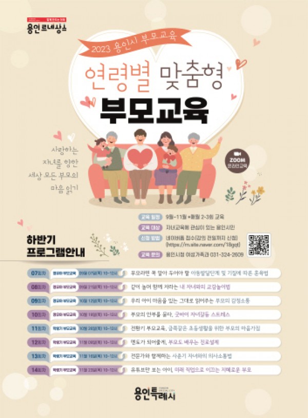 용인특례시(시장 이상일)가 오는 7일부터 11월 23일까지 ‘2023년 하반기 연령별 맞춤형 부모교육’을 진행한다고 4일 밝혔다. 강의는 온라인 화상회의 플랫폼인 ‘줌(zoom)’을 통해 오전 10시부터 12시까지 진행된다. 9월에는 월 2회(둘째 주, 넷째 주 목요일), 10월부터는 월 3회(둘째 주, 셋째 주, 넷째 주 목요일)에 걸쳐 이뤄진다.하반기 연령별 맞춤형 부모교육 포스터 강의 전날까지…
