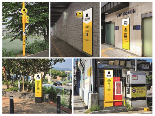 용인특례시(시장 이상일)가 시민의 안전을 위해 범죄예방환경디자인(CPTED) 기법을 활용한 비상벨 표준디자인을 개발하고 지역 일부 지역에 해당 디자인이 적용된 비상벨을 시범 설치한다고 4일 밝혔다.좌측 상단부터 벽면형 비상벨 폴대형 비상벨 화장실형 비상벨 지주형비상벨 학교앞 SOS 안심존 비상벨 표준디자인 및 가이드라인은 ‘2023 생활안전을 더하는 공공디자인 사업…