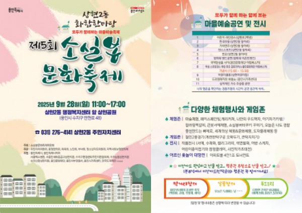용인특례시(시장 이상일)는 가을을 맞아 수지구 곳곳에서 지역 주민을 위한 다채로운 문화 행사가 열린다고 24일 밝혔다. 28일 수지구 상현2동 행정복지센터 상현공원에서는 제5회 소실봉 문화 축제가 개최된다.구는 주민 모두가 함께 즐기며 주민 간 유대감을 높이는 것은 물론 예전 느진재 ‘만현(晩峴)’ 마을의 정서를 되살리고 소실봉 지역 고유의 문화자산을 계승·발전시키기 위해 매년 축제를 개최하고 있다.행사는 기념식을 시…
