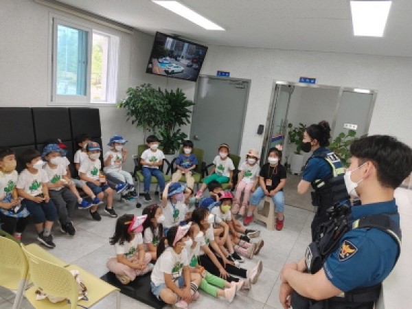 용인동부경찰서 서천파출소(소장 정두순)는 지난 6월 7일과 9일 오전, 관내 시립 금빛 서내 어린이집 및 서농초 병설 유치원생 등 80여 명을 초청, 파출소 견학 체험 교실을 운영하였다. 이번 체험교실은, 코로나 일상회복 이후 도심 속 파출소 특성을 감안해 아동범죄 및 교통안전 교육 등을 실시해 어린이 중심 체감안전도를 향상하는데 그 취지를 두고 있다.112 순찰차…