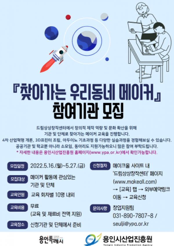 용인시산업진흥원, 용인시민과 중고등학생 대상의 2022년 찾아가는 우리동네 메이커 교육 참가자 모집