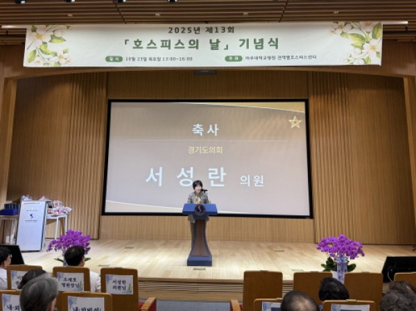 경기도의회 서성란 의원(국민의힘, 의왕2)은 23일(목) 아주대학교병원 대강당에서 열린 「2025년 제3권역 호스피스의 날 기념행사」에 참석해 축사를 전했다.251023 경기도의회 서성란 의원, ‘제13회 세계 호스피스의 날’ 기념 축사 전해 (1)이번 행사는 ‘생의 마지막까지 존엄을 지키는 돌봄’의 의미를 되새기기 위해 마련된 자리로, 경기 남동부권 호스피스 전문기관 관계자와 자원봉사자, 의료진 등 다수가 참석했다.…
