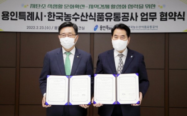 용인시는 23일 시청 시장실에서 저탄소 식생활 문화를 확산하고 지역경제 활성화를 위해 한국농수산식품유통공사(aT)와 ‘저탄소 식생활 문화 확산과 지역경제 활성화를 위한 업무 협약’을 체결했다. 백군기 용인시장이 23일 저탄소 식생활 문화 확산과 지역경제 활성화를 위해 한국농수산식품유통공사와 추진한 업무 협약서에 서명을 하고 있다 시와 aT는 협약에 따라 먹거리 생산‧유통‧소비 과정에서 발생하…