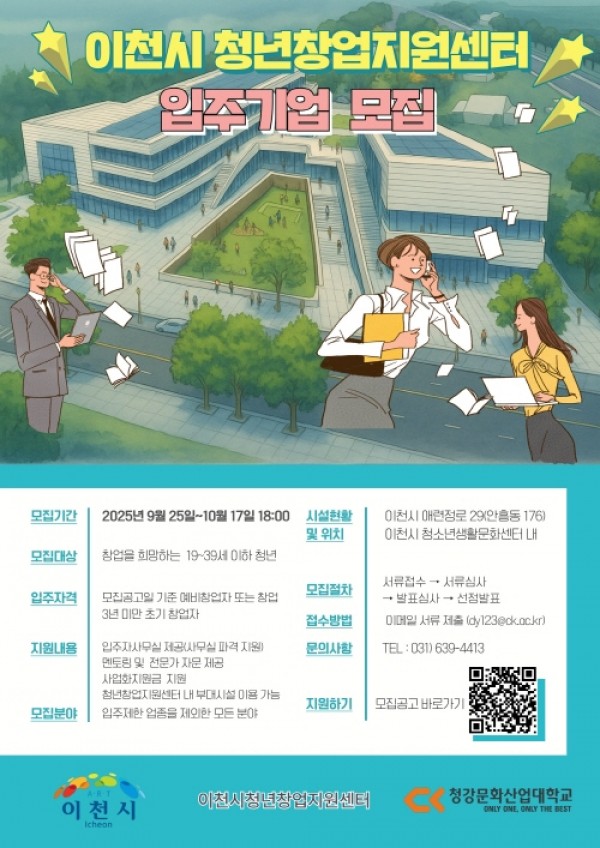 이천시(시장 김경희)는 오는 2025년 11월 개소 예정인 ‘이천시 청년창업지원센터’를 통해 지역 청년들이 도전과 혁신을 현실로 바꿀 수 있는 창업 전용 거점 공간을 마련한다. 청년창업지원센터는 단순한 공간 제공을 넘어, 아이디어 실험실이자 성장 플랫폼으로서 창업 아이디어 발굴부터 사업화, 네트워킹까지 원스톱 지원체계를 구축해 지역에 지속 가능한 창업 생태계를 조성할 계획이다.5. 이천시 최초 청년창업지원센터 입주기…