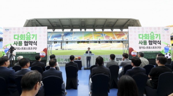 수원종합운동장에서 프로축구를 즐기다 닭강정을 샀을 때, 앞으로 다회용기에 담겨 나옵니다. 고양 소노 아레나에서 농구 경기를 관람하다 피자와 커피를 주문할 때도 같습니다.사진자료 1오늘 김동연 경기도지사와 도내 프로축구-야구-농구-배구단(총 18개)이 경기장 내 모든 식음료점, 주변 푸드트럭에 다회용기를 도입하기로 협약을 맺었습니다. 수원KT위즈파크 야구장, 수원월드컵 축구경기장에서는 이미 다회용기를 사용하고 있는데, 이제 경기도 프로스포츠 경기장 전역으로 확대되는 것입니다.사진자료 2도와 도내 모든 프로 스포츠구단의 다회용…