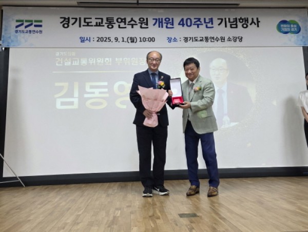 김동영 경기도의회 건설교통위원회 부위원장은 9월 1일(월) 경기도교통연수원 소강당에서 열린 ‘경기도교통연수원 개원 40주년 기념행사’에 참석하여 축사를 전하고, 경기도교통연수원 발전에 기여한 공로를 인정받아 감사패를 수상하였다.250902 김동영 의원, 경기도교통연수원 개원 40주년 맞아 감사패 수상(1)먼저 개원 40주년 축사에서 김동영 부위원장은 “경기도교통연수원이 지난 40년간 도내 운수종사자 교육과 도민 교통안전교육에 매진해 온 덕분에 경기도에 올바른 교통문화가 정착되어 가고 있다.”면서 경기도교통연수원 임직원의 노…