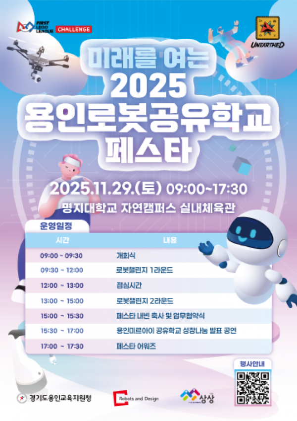 로봇·예술 융합 미래교육의 장, 용인교육지원청 '미래를 여는 2025 용인로봇공유학교 페스타' 개최용인교육지원청(교육장 조영민)은 오는 11월 29일(토), 명지대학교 실내체육관에서 「미래를 여는 2025 용인로봇공유학교 페스타」를 개최한다고 밝혔다. 이번 행사는 용인지역의 신산업 환경을 교육에 반영하고, 로봇 기반 융합교육을 통해 미래 인재를 양성하기 위한 목적으로 마련됐다.페스타에서는 ▲로봇챌린지 대회 ▲한국로봇산업협회와의 업무협약식 ▲용인미르아이공유학교 성장나눔 발표 공연 등 다채로운 프로그램이 운영되며, 학생·학부모 등 약 …