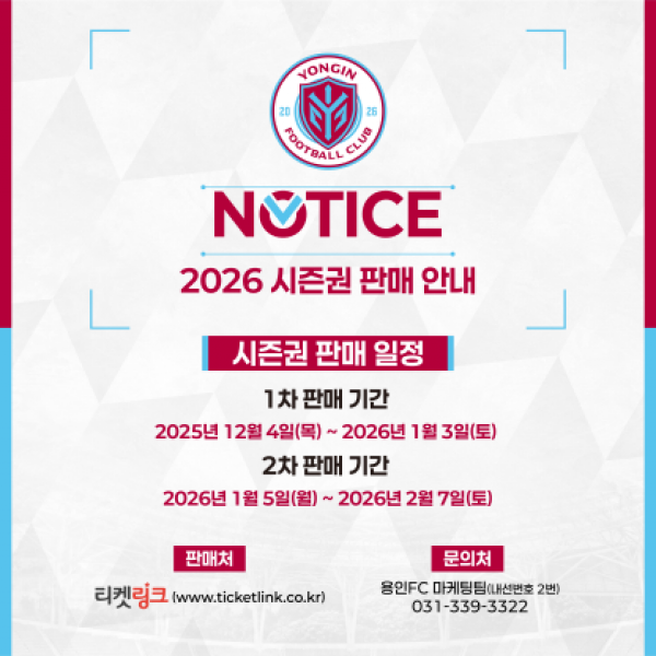 (재)용인시시민프로축구단(이하 용인FC)은 2026시즌 창단을 앞두고 시즌권 판매를 시작했다. 첫 시즌을 함께할 팬들에게 소장 가치와 관람 경험을 동시에 제공하는 맞춤형 패키지를 선보이며, 첫 시즌의 특별한 순간을 함께할 수 있도록 준비했다. 용인FC, 2026 K리그2 시즌권 판매 개시 시즌권은 카드형과 티켓북형 두 가지 타입으로 구분하여 상품별 혜택을 차별화했다. ▲프리미엄 지정석 ▲W 일반석 ▲E/N 일반석으로 나뉘며, 프리미엄 지정석은 카드형으로만 한정 판매해 시즌 내내 동일 좌석을 보장하며 별도 예매 …